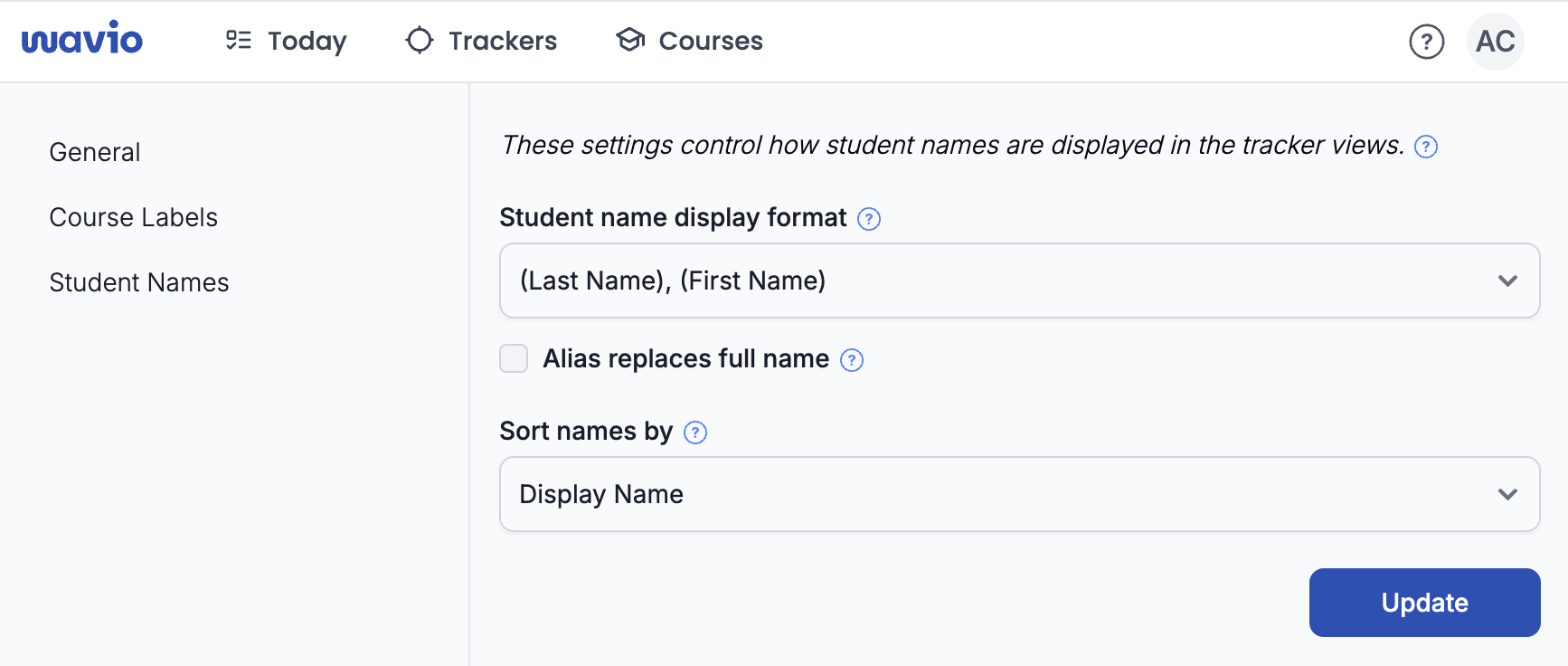 You can configure how student names are displayed and ordered in the tracker views. Click on the user menu in the upper right corner and select Profile. Then click on Student Names in the left sidebar.