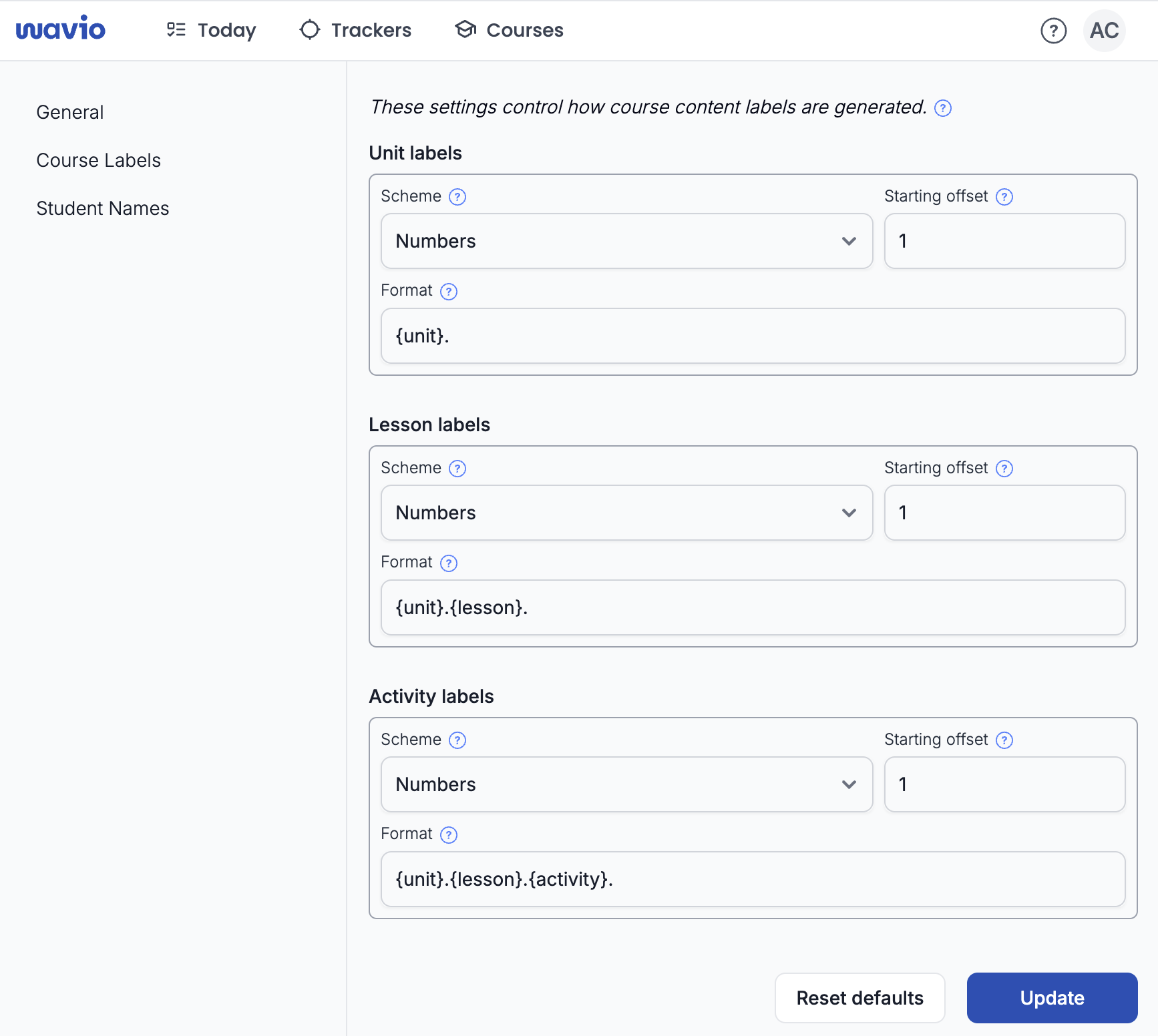 This is the format used to display the label based on the numbering schemes and starting offsets. The special placeholders {unit}, {lesson}, and {activity} are replaced with the unit, lesson, and activity numbers in the resulting labels.